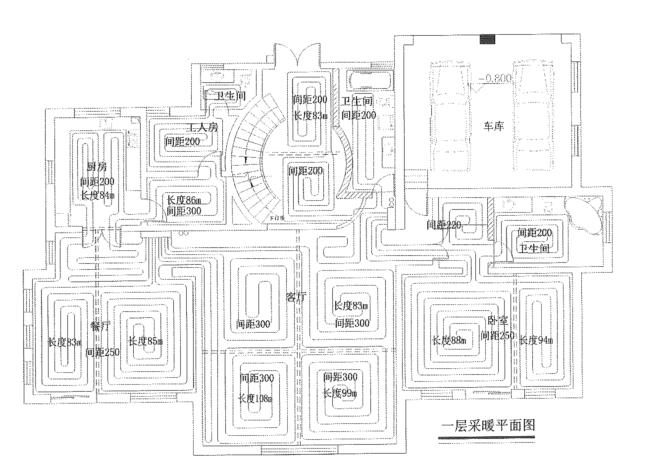 當然如果是間歇供暖,對應間距建議加密50mm。即頂層主間距可取200mm(個別邊角房間間距可取150mm);非頂層主間距可取250mm(個別邊角房間間距可取200mm)。室內地暖盤管末端散熱余量較大,應增設溫控裝置。